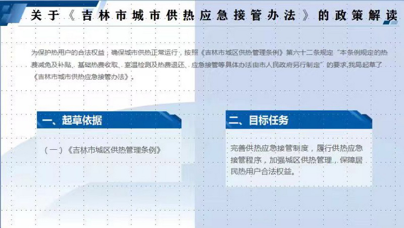 为保护热用户的合法权益,确保城市供热正常运行,按照《吉林市城区供热管理条例》第六十二条规定“本条例规定的热费减免及补贴、基础热费收取、室温检测及热费退还、应急接管等具体办法由市人民政府另行制定”的要求,我局起草了《吉林市城市供热应急接管办法》。